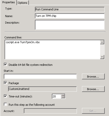 The script also do some logging so you can check for success of the execution. The log file is saved to SYSTEM’s %TEMP% (usually C:\windows\TEMP). The name of the file will be: TurnOnTpm.log. Please note that the script has to be run after the operation system is installed and configured. It will not work in WinPE. There is another important thing to note: The TPM will not be activated until the computer is rebooted twice. Yeah, don’t ask me why twice. You can achieve this easily by adding two “Reboot Computer” steps after the “Run command line” step.